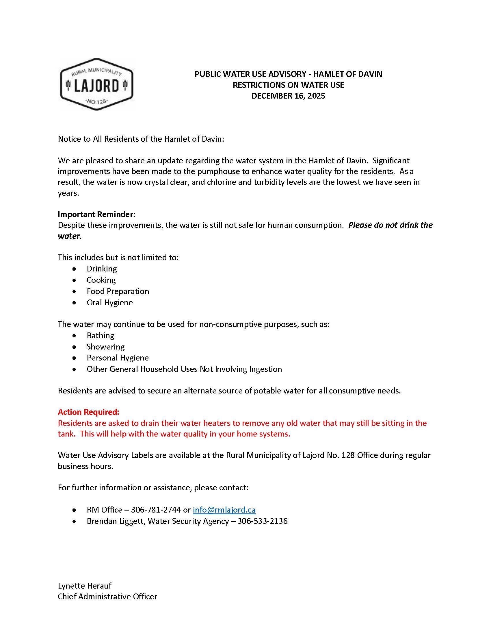 HAMLET OF DAVIN - PUBLIC WATER USE ADVISORY - RESTRICTIONS ON WATER USE